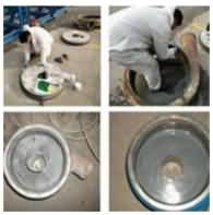雙組分,以特種金屬碳化物、納米復合超硬顆粒為骨材、DNI-PDMG預聚體為基礎的耐磨復合材料,具有超強耐磨性、柔韌性、耐水、耐油、耐酸堿性。適用(-60℃-120℃)惡略環境中設備過流沖蝕(顆粒大于50mm)、設備的局部修復、設備預涂耐磨層,如旋流器、浮選柱、浮選機、泡沫槽、分級機、攪拌桶、溜槽、管件類、渣漿泵、脫硫泵、污水泵、往復泵、隔膜泵等泵類修復。