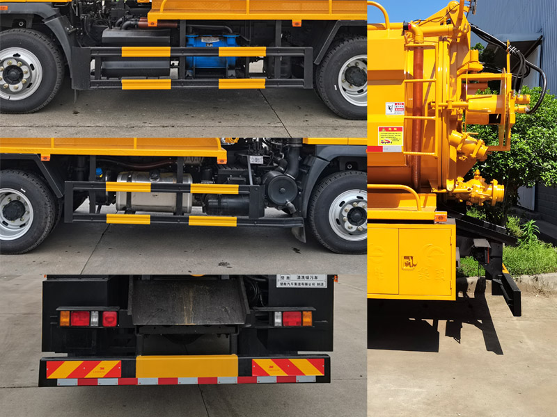其它:該車用于下水道疏通清洗及吸污并具有舉升功能,主要專用裝置:罐體和清洗吸污裝置.污水罐外形尺寸(總長×直徑)(mm):4600×1600,污水罐總容量8.5立方米,有效容積8.13立方米;罐體兩側為水箱,截面由圓弧及多邊行組成,外形長為4000mm,清水罐總容量3.9立方米,有效容積3.88立方米;清水罐和污水罐為獨立罐體,清洗、吸污兩種功能不能同時使用,兩個罐體不能同時滿載.側、后防護材料均采用Q235,側防護螺栓連接,后防護焊接,后防護截面尺寸(mm):200×60,離地高420mm.ABS型號/廠家:CM3XL-4S/3M(4SF)/廣州瑞立科密汽車電子股份有限公司,XH-KQ4S3M-E01/廣州市西合汽車電子裝備有限公司.僅選用3900mm軸距底盤,隨底盤選裝駕駛室.