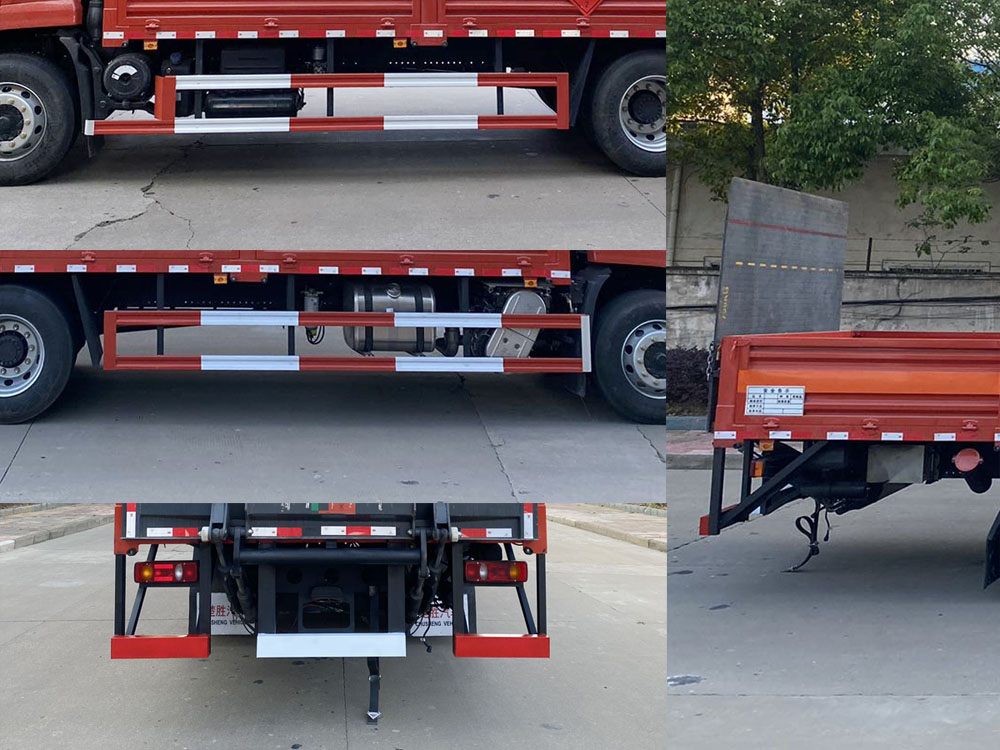 其它:該車適用于運輸危險品,運輸具有獨立容器(瓶)包裝的物品.運送危險物品類項號:2.1,2.2.側,后防護材料均為Q235,側防護焊接連接,后防護焊接.截面尺寸120×50mm,下邊緣離地高440mm.選裝后部無液壓尾板時,后防護材料為Q235,后防護焊接.截面尺寸120×60mm,下邊緣離地高440mm.僅選用排氣管前置、限速裝置(限速80km/h)、前輪盤式制動及子午線輪胎的底盤,后軸裝備空氣懸架,轉向輪安裝輪胎爆胎應急防護裝置,安裝帶有衛星定位功能的行駛記錄儀.EBS型號/生產廠家:EBS5/東科克諾爾商用車制動系統(十堰)有限公司.采用的發動機與油耗值(L/100Km)對應關系為:B6.2NS6B210/26.5,DDi50E190-60/23.9.液壓升降尾板收起狀態水平長度為290mm,尾板質量為550kg.該車型可選裝直接供電式ETC車載裝置.廂體選裝無柵欄,選裝柵欄樣式,選裝貨箱箱板結構.隨底盤選裝燃油箱,電瓶,尿素罐,儲氣筒,后處理左右安裝位置,選裝后處理隔熱罩.僅采用底盤4700mm,5000mm軸距改裝.