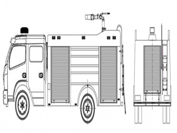 總體布置 | 整車由消防員乘員室和車身兩大部分組成,車身布置采用三分體式結構,前部為器材箱,中部為水罐,后部為水泵房,罐體為平行六面體廂式容罐。 |